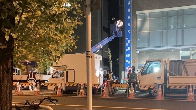 寒さが増した11月28日の夜、区の工事車両と市職員、警備員たちが、神田警察通りに予告もなく押し寄せ、あっという間に警察前のイチョウの木を伐採してしまいました!