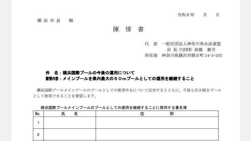 15日の市議会への提出後に動きがありました。 皆様のご協力の甲斐あり、まず神奈川県水泳連盟がメインプール存続のための署名活動を開始しました。追って横浜水泳協会も横浜市長宛に抗議の声明を出しました。さらには賛同して下さる市議の方が市の常任委員会でこの件につき発言するところまで至りました。皆様のお陰です。ありがとうございます。以下議事動画をぜひご覧下さい。https://youtu.be/w3qXbOtsEwI?si=i58UGXmyH37crJna