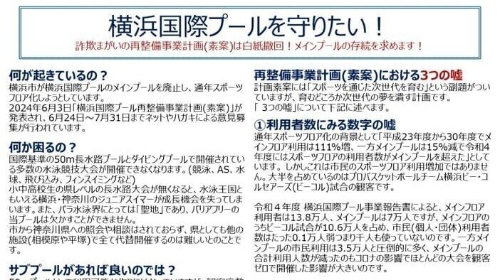横浜国際プール メインプールの存続を求める会においては添付画像の通り、問題点をまとめております。