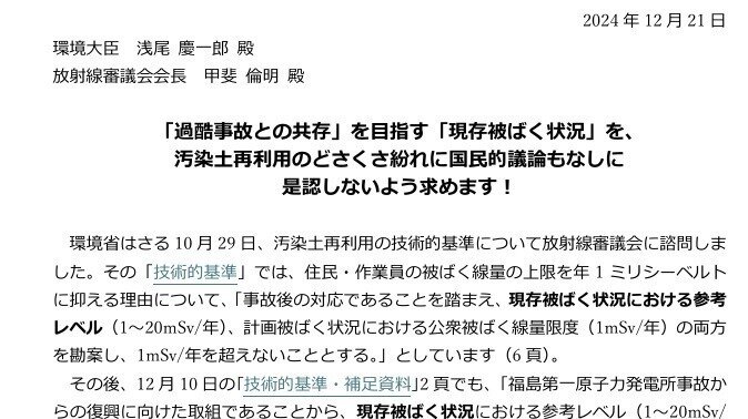 「過酷事故との共存」を目指す「現存被ばく状況」を、 汚染土再利用のどさくさ紛れに国民的議論もなしに 是認しないよう求めます!