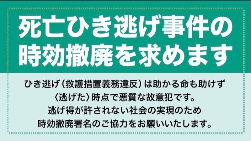 救護措置を取っていれば命が救われた事故は、多くあると思います。被害者に怪我をさせ、重傷、死亡させた行為を重く捉えて頂き、時効撤廃の法改正に向けて社会に呼びかけております。