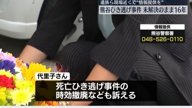 熊谷市小4男児死亡ひき逃げ事件遺族の母親です。当時10歳の息子は、16年前に2台の車両にひき逃げされ、頭部をひかれ即死でした。今でも2台のひき逃げ犯は逃げ続けています。