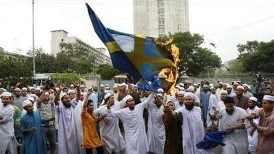※写真は受け入れられた先のスウェーデンで、イスラム法による統治を求めてスウェーデン国旗を燃やすイスラム教徒。