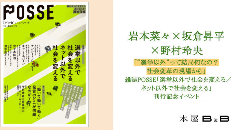 しかし、「選挙以外で社会を変える」とは、具体的にはどういうことなのでしょうか。普段は「残業代が払われない」「家を追い出されてしまった」等の生活相談を受けながら、雑誌で言論活動をしているNPO法人POSSE。その代表の岩本菜々さん・雑誌編集長の坂倉昇平さんに加え、リニューアル企画を担当した担当編集も交え、選挙以外で社会を変えるとはどういうことなのか、選挙でリベラルが大敗した今どんな社会を目指すべきか、また、社会変革の現場はどこにあるのか、語り尽くします。