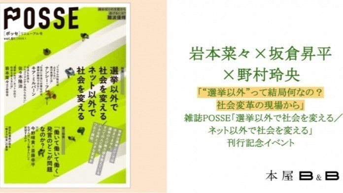先日発売しました雑誌『POSSE』リニューアル号「選挙・ネット以外で社会を変える」ですが、おかげさまで発売直後から多方面で大きな反響をいただいております。そこで、「誌面の内容をさらに深掘りし、直接語り合える場が欲しい」という声にお応えする形で、この度、急遽トークイベントを開催する運びとなりました!