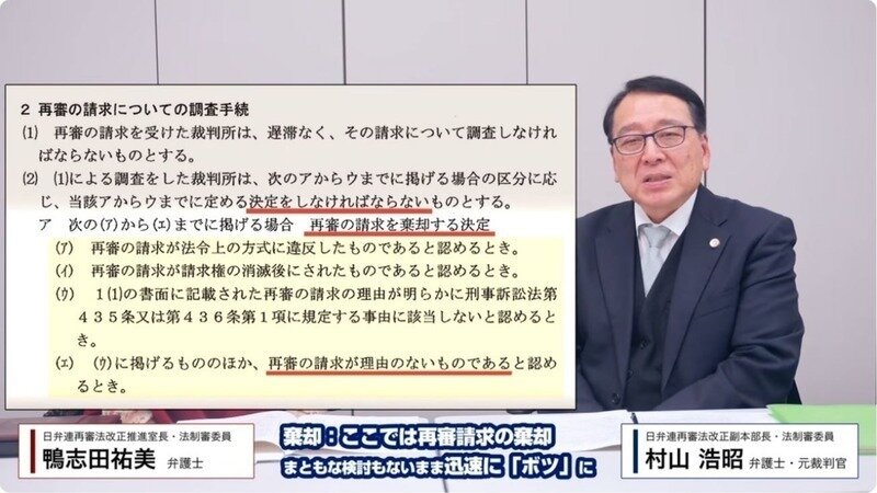 もっとも大きな問題がスクリーニングという調査手続きです。(上記写真)それまで大きな論点になっていないものを恣意的に出してきたそうです。そもそも再審請求審がスクリーニングですが、さらにその前の段階でスクリーニングをして、ほとんどの事件が迅速に棄却されるような内容だそうです。