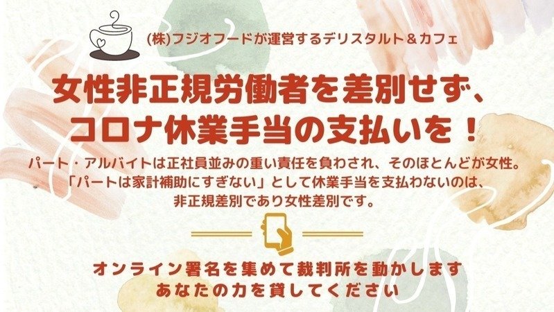 この度、この裁判勝利のためにネット署名「女性非正規労働者への差別を許さず、コロナ休業手当の支払いを命じてください!」を立ち上げました。女性労働者・非正規労働者に対する差別の克服にとって、重要な裁判となっています。ぜひ下記URLからネット署名への賛同と拡散をお願いいたします。
