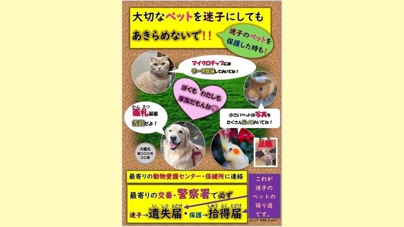 Обновление к петиции環境省、警察庁は、コロナ禍に増加しているペット(愛玩動物)迷子・遺棄について、早急に防止及び救済のシステムを強化してください。ペットの迷子の窓口は警察署 必ず遺失届(迷子)、拾得届(保護) これを世の中に広めるお手伝いをお願いします