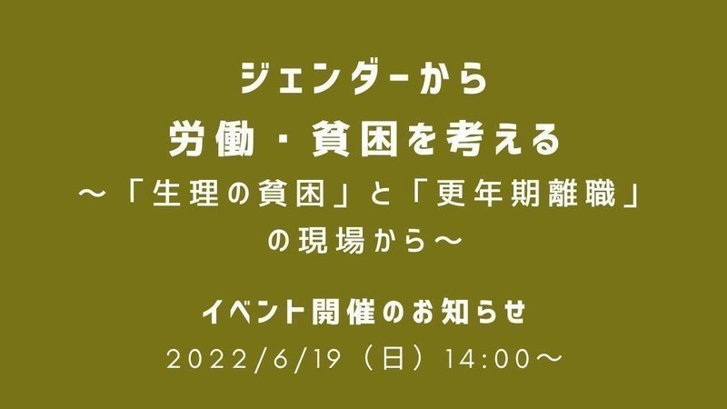 「職場での生理・更年期差別を法律で禁止してください!」の署名キャンペーンとのコラボ企画で、6月19日(日)14:00~、オンラインイベント『ジェンダーから労働・貧困を考える~「生理の貧困」と「更年期離職」の現場から~』を開催します。(申し込み先:リンク)