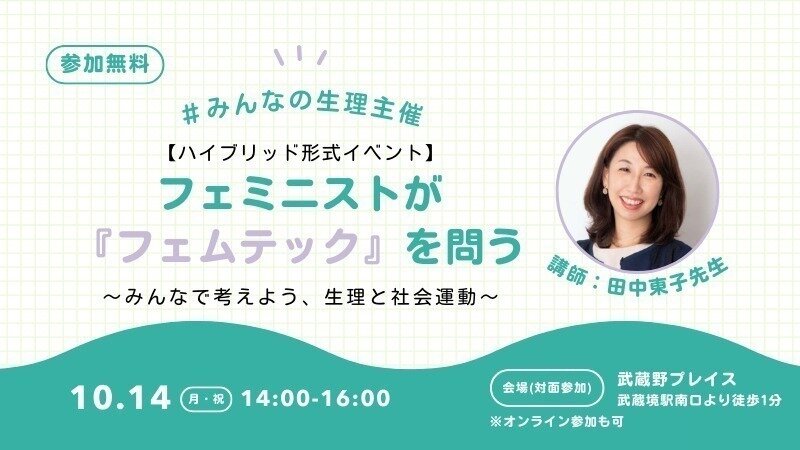 10/14(月・祝)14:00-16:00に「フェミニストが『フェムテック』を問う」と題したイベントを開催します!東京大学の田中東子先生をお呼びし、テクノロジーを介して「労働力」や「産む身体」として期待される月経のある身体について考えます。JR中央線・西武多摩川線「武蔵境駅」南口徒歩1分の武蔵野プレイスでのご参加とオンラインでのご参加のオプションを設けています。参加無料で、事前知識がなくても大丈夫ですので、お気軽にこちらからお申込みください!