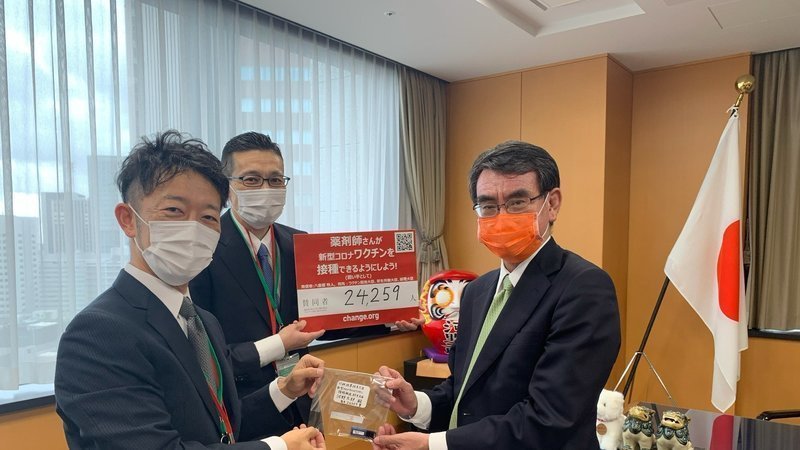 このたび私達はオンライン署名サイトChange.orgで、4月23日より「薬剤師さんが新型コロナワクチンを接種できるようにしよう!」(担い手として)という署名活動をはじめ、3週間強で24259名の方に賛同して頂き、本日5月17日に河野太郎ワクチン担当大臣に提出しました。