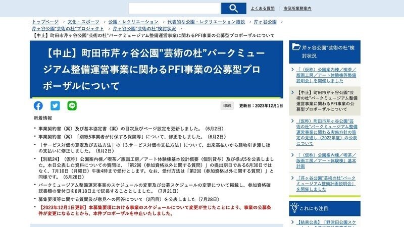 速報!町田市の新工芸館建設と国際版画美術館の改造を含むPFI手法での芹が谷公園一帯大規模再開発計画が一旦中止となりました。目黒区にも微かな希望の光が見えてくるだろうか。