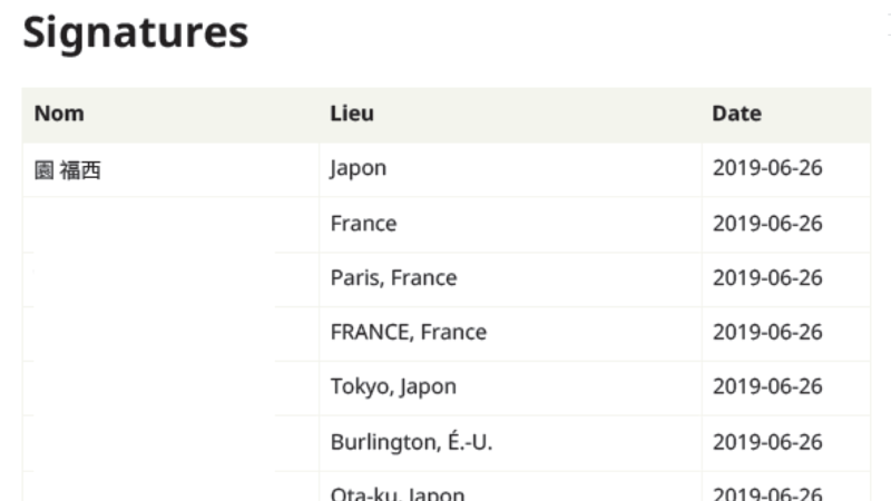 皆さまの署名は、「姓名、おおまかな所在地、サインした年月日」が掲載されたPDFにまとめられています。(写真参照)