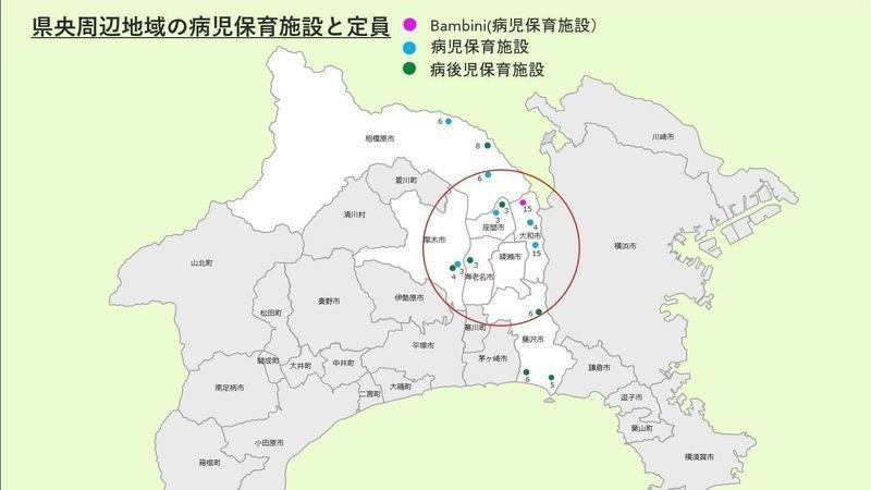 2020年3月1日現在神奈川県央地域の病児保育施設と定員の状況です。中規模市が入り組んでいる地理と、施設が偏在している現状があります。IT化と広域化が進んで、より多くのご家庭にとって使いやすい施設となるよう願っております。