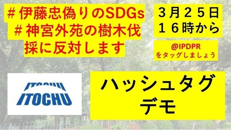 伊藤忠商事は、持続可能な社会に貢献するとして、SDGsやESGを企業理念としていますが、大量の樹木伐採、リノベーションできる歴史的なスタジアムの破壊、風致地区に高層ビルが乱立する神宮外苑再開発に参画することは、まるで真逆の行為です。この企業理念に反する大きな矛盾、偽りをどう考えているのでしょうか。みんなでそのことを追及しましょう。