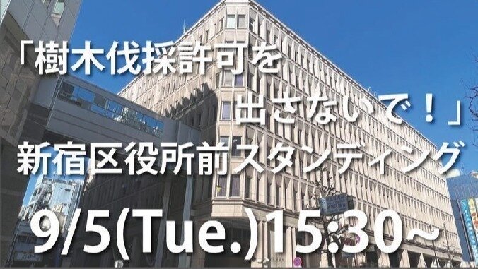 新宿区への樹木伐採認可取り消し訴訟の団長でもある未来の子どもたちの笑顔をつくる明治神宮外苑をかんがえる会の大澤暁さんの呼びかけで、新宿区役所前で樹木伐採申請を許可しないよう求めるスタンディング・アクションが行われます。