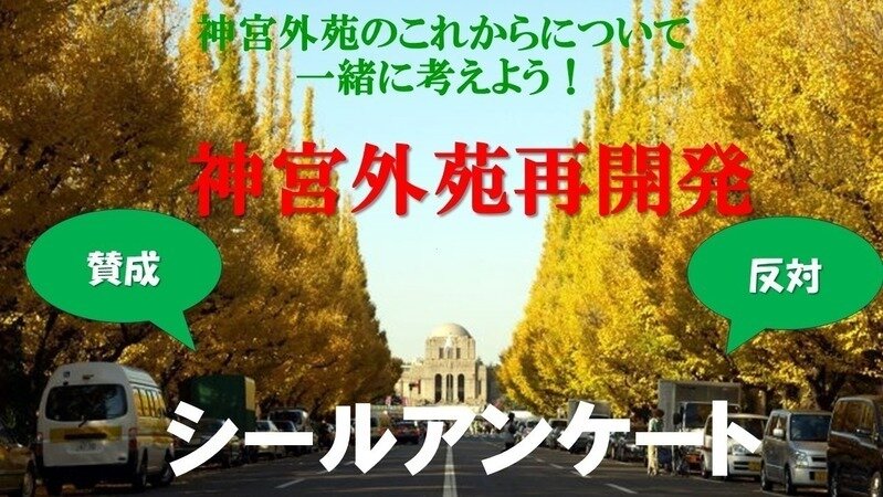 例年通り、イチョウ並木を見るために多くの人が集まる事が想定されますが、マスメディアでも間違いなく取り上げられると思いますので、この期間の土日を使って、イチョウ並木を見に来る人たちを対象として、シールアンケートとチラシ配布を実施し、「神宮外苑再開発の問題」を効果的に周知出来ればと思っています。