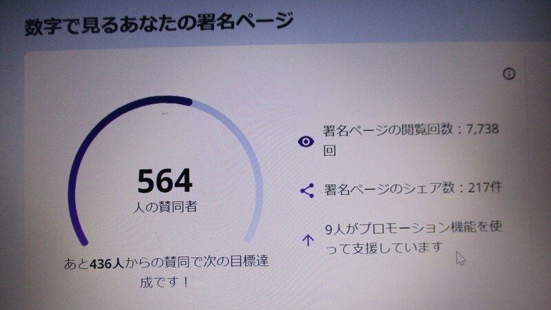 写真で見ていただけるように、オンライン署名は2月6日現在、賛同者は564人ですが、この署名サイトを閲覧してくださっている人は7738回、アクセスして下さっています。