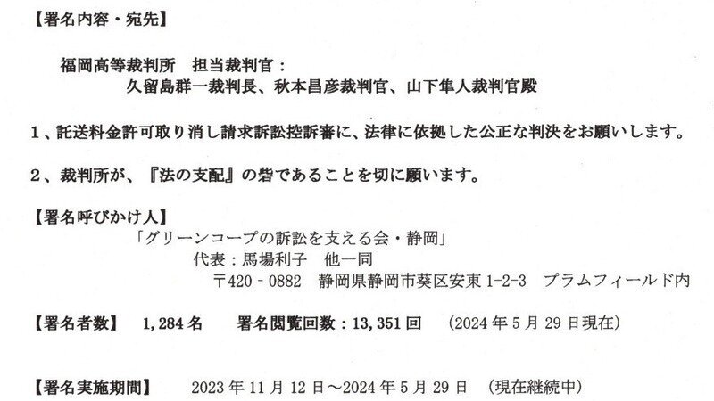 グリーンコープが提訴している「託送料金変更認可決定取消訴訟・控訴審」 に公正な審査と判決を求める署名に賛同して下さっている皆さまへ