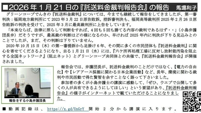 裁判の経緯を報告するのは、難しいですが、今年1月21日に市民団体が主催して【託送料金裁判報告会】が開かれ、託送料金裁判の小島弁護団長が、資料を提示しながら、裁判の要点を分かりやすく講演をしました。