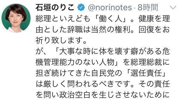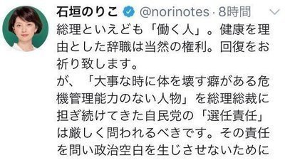 石垣のりこ参議院議員が安倍総理の辞任会見を受け、8月28日のツイートで「大事な時に体を壊す癖がある危機管理能力のない人物」と発言をしました。