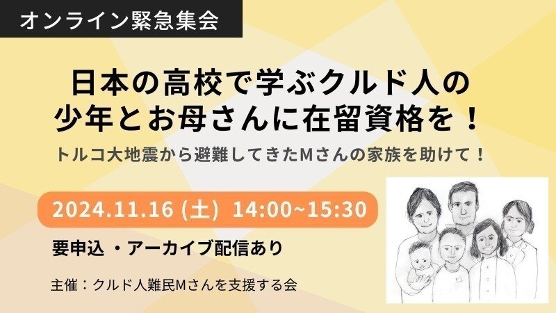 2人の在留資格の申請は先月再び「不許可」とされ、入管から12/3までに出国をいわれています。 このままではMさん家族が離れ離れで暮らすことになってしまいます。この危機を乗り越え、2人の在留資格取得に向けて、今週末の11/16(土)14時からオンラインで緊急集会を企画しました。