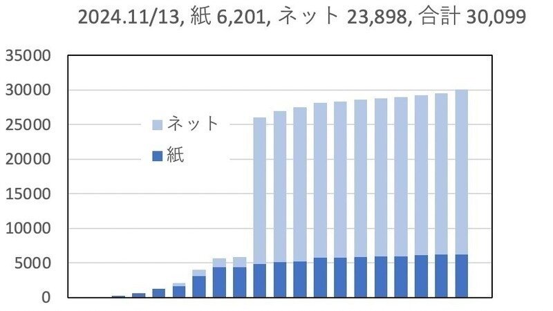 11月13日時点で署名用紙での6,201筆、オンライン署名23,898筆、合計30,099筆となりました。その後、さらに伸びて、現在オンライン署名は24,112筆となっています。