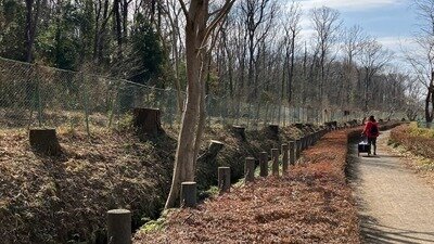 野火止緑道では2024年から2026年の間に2回、遊歩道側と平林寺側で大規模伐採が行われました。今までも大規模な伐採は4~5年に一度ありましたが今回のものは短期間に連続しており、2024年は直径10㎝以下の樹木、今回はそれより大きい樹木も伐採されました。これにより野火止緑道の樹木は大幅に減少しました。