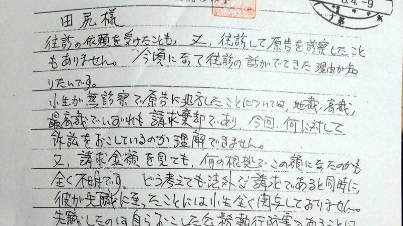 本日、4月20日に平野クリニック平野医師から提出された準備書面…埼玉県警が間違いなく平野医師が往診に訪れたと言っているのに対し、平野医師が反論、診察と答えた。