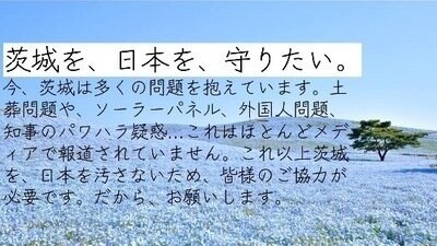 茨城県を、日本を守りたい。土葬問題や、ソーラーパネル、外国人問題、知事のパワハラ疑惑…いろんな問題を抱えている。そんな茨城を守りたい。