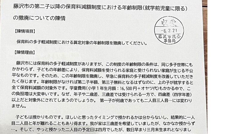 先日の子ども文教委員会において、私の提出した保育料の議会陳情が全会一致で趣旨了承(可決)されました。※陳情の原稿を添付していますので、ぜひご覧ください。