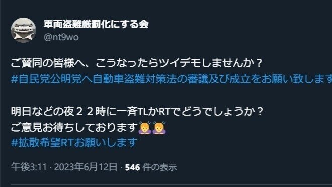 「#自民党公明党へ自動車盗難対策法の審議及び成立をお願い致します」