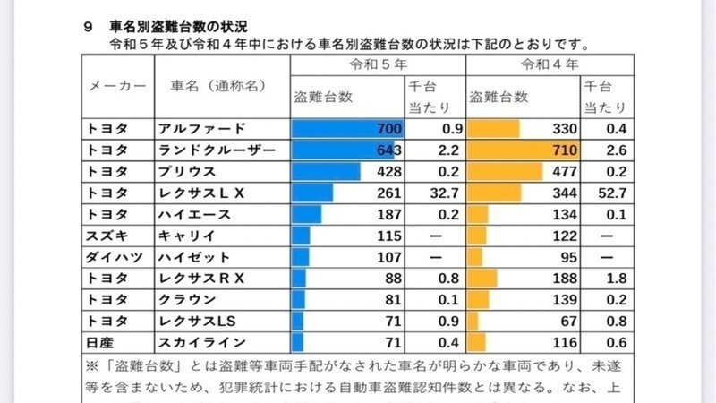 こんにちは。令和5年及び令和4年の車名別盗難台数が発表されました。