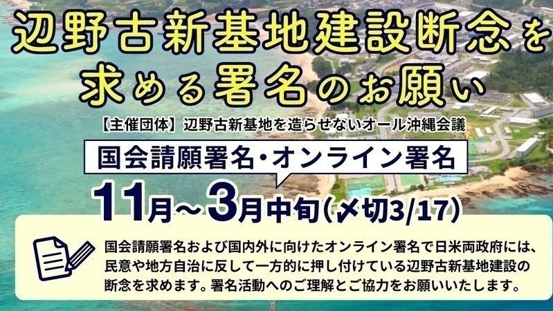 その民意を政府に伝えるべく、オール沖縄が、請願署名とオンライン署名を始めました。沖縄の県民の声のみでなく、日本各地、ひいては世界からの「辺野古基地建設断念を」の声を届けましょう。