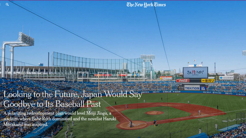ニューヨーク・タイムズ紙は、ベーブ・ルースが歴史的な1934年の日米野球日本ツアーで5本のホームランを打ち、村上春樹が処女作のインスピレーションを受け、村上宗隆が王貞治を抜くシーズン56本目の本塁打を打つなど、神宮球場が約100年にわたって重要な歴史の舞台となってきたことを紹介し、分裂を招く再開発計画により、その歴史的球場が取り壊される可能性があることを指摘しています。