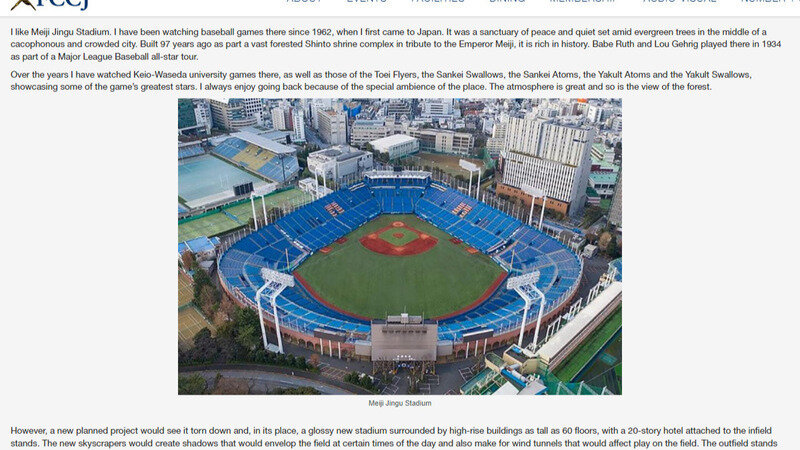 外国人記者クラブの機関誌「Number 1 Shimbun(No.1新聞)」6月号が、神宮球場の取り壊し・建て替え問題を巻頭エッセイで取り上げています。筆者は、本署名の発起人スポーツライターのロバート・ホワイティング氏です。記事の内容はこちら(英文)をご参照ください。