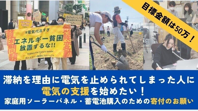 この度、エネルギー貧困に陥る多くの人たちを支えるため、11月より、フードバンク仙台は家庭用ソーラーパネルと蓄電池を使い、電気の供給が止められる世帯や「節約」が限界にきた世帯に対してエネルギーの一時的な供給を行うための新たな取り組みをはじめます。エネルギー貧困の取り組みを行ってきたライフライン無償化プロジェクトとFridays For Future Sendaiは合同で寄付を呼びかけさせていただきます!
