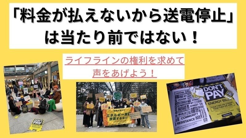 このような供給停止への規制は、ライフラインを権利として確立しようとする市民の声によって実現するものです。2022年イギリスでは、電気・ガス料金の上限が80%引き上げることが発表され(※3)今の日本と同様に多くの市民がエネルギー貧困の危機に陥りました。これに対し「Don'tPay」運動は、電気料金の不払いを通して、暴騰するエネルギー価格と増益を続けるエネルギー企業への抗議を示し、電気料金引き上げをする10月1日までに20万人が不払いを表明。10月1日に行った大規模な抗議アクションの効果もあり、1971ポンド→3549ポンドの予定を2500ポンドまでの引き上げへと大幅におさえました(※4)。