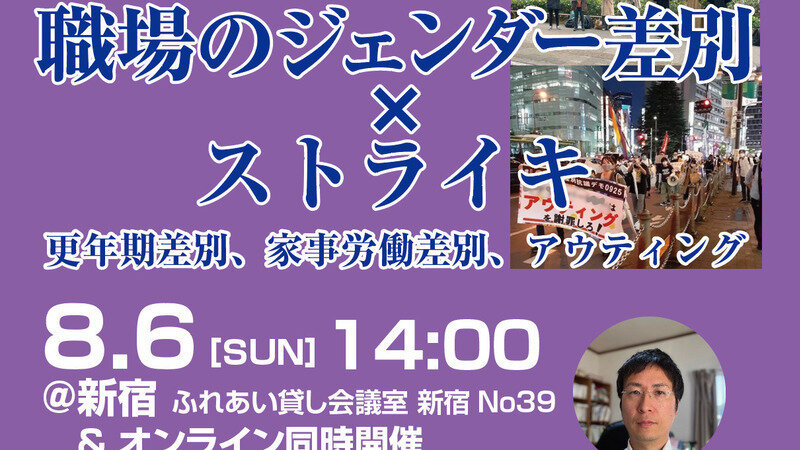 私たちも連携しているNPO法人POSSEが、8/6(日)に「職場のジェンダー差別×ストライキ〜更年期差別、家事労働差別、アウティング」というイベントを、学生や若者を対象に開催します。