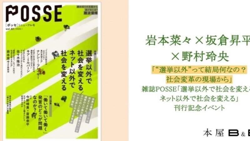 先日発売しました雑誌『POSSE』リニューアル号「選挙・ネット以外で社会を変える」ですが、おかげさまで発売直後から多方面で大きな反響をいただいております。そこで、「誌面の内容をさらに深掘りし、直接語り合える場が欲しい」という声にお応えする形で、この度、急遽トークイベントを開催する運びとなりました!