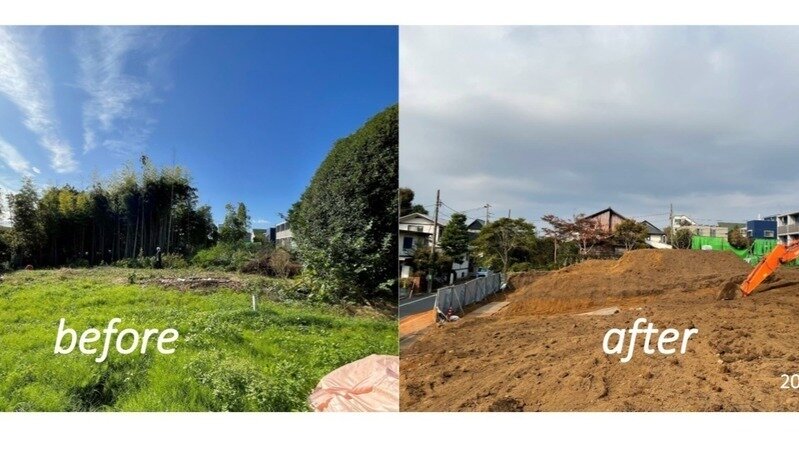 (写真は竹林伐採前と伐採後の写真です。かつて輝くばかりだった緑はなくなり、この地にはもう、動物も鳥も虫も一つの命も存在していません。)