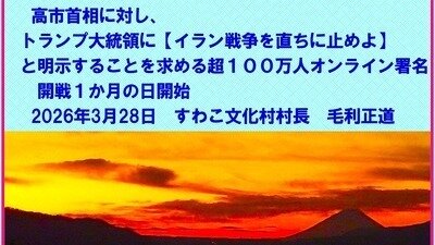 なお、私たち「すわこ文化村」は、「高市首相は【ホルムズ海峡への自衛隊派遣NO‼】を明言せよ」とのオンライン署名を開始したところ、48時間で5万筆超の署名が寄せられた(これは現在も継続中である)。AIによると、これまでの国内署名総数ランキングでは、❶「STOP!インボイス」52万、❷「東京5輪中止」47万、❸「児童福祉法改正」45万とのことである(因みに短期間での署名数としては、48時間5万筆という私たちの上記署名がTOPであった)。