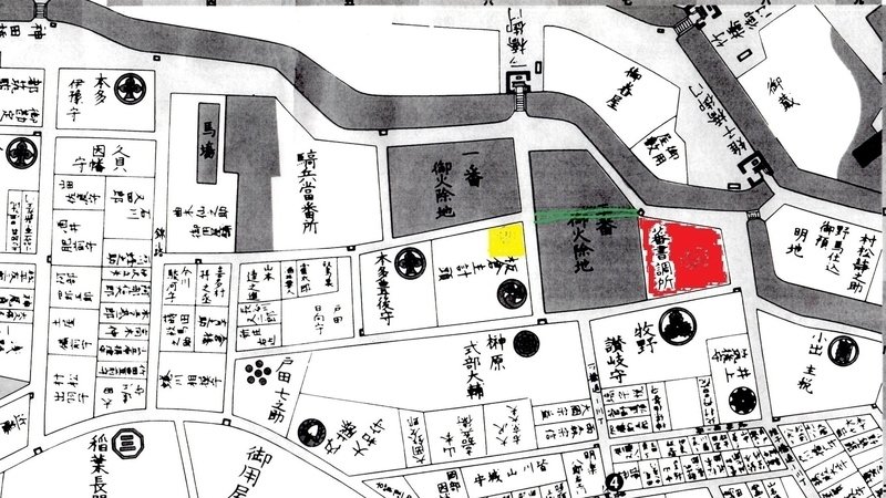 添付する地図は、1862(文久3)年のもの。学士会館周辺。赤→蕃所調所、黄色→現在の学士会館、緑線→100年の街路樹。