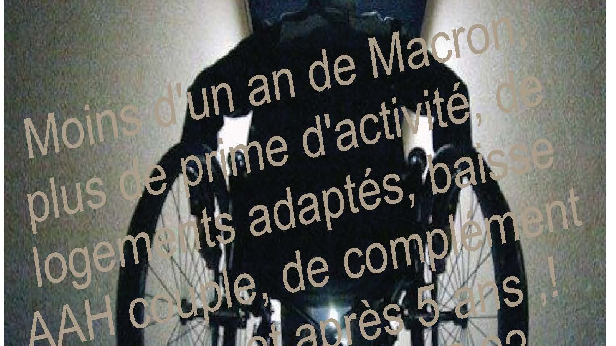 Pour être plus clair, le gouvernement Macron a supprimé le complément de ressources, a baissé le coefficient de calcul de la prise en compte du revenu du conjoint(e) pour l'AAH couple, a supprimé la prime d'activité pour tous les pensionnés d'invalidité, a baissé les APL de 5€ par mois, a augmenté la CSG, a supprimé des postes d'AVS, il a fait des économies sur le budget de soutien aux personnes handicapées en France