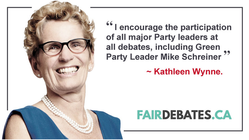 Great news: Premier Kathleen Wynne has officially and publicly endorsed our call for fair debates. Now we're waiting to hear from Andrea Horwath and Doug Ford. Kudos to the Liberal Party of Ontario for showing leadership and a true commitment to democratic principles.