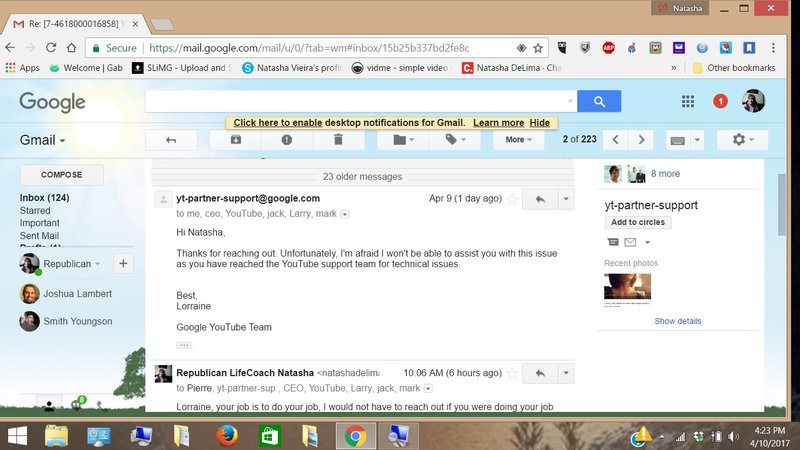 Sample of the criminal and civil negligence is the last email from Lorraine, trying to divert her own liablity to do her own job on Youtube.