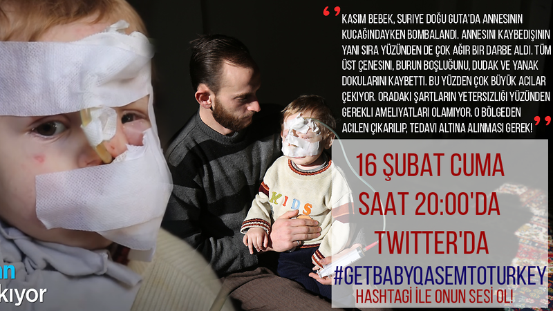 2 yaşında bombalanarak yüzü parçalanmış Kasım bebek Doğu Guta'da ve hâlâ tedavi bekliyor! Hikayesinin duyulmasının üzerinden 2 ay geçti ve insanoğlu hâlâ sessiz hâlâ kör hâlâ sağır! Bizlerin sustuğu her an acı çekmekte olan Kasım bebek için güzel bir gelecek ise sadece bir hayal! Neden bunu değiştirebilecek gücün varken susuyorsun? Artık SUSMA! 16 ŞUBAT CUMA GÜNÜ SAAT 20:00'DA TWITTER'DA #GetBabyQasemToTurkey hashtagi ile onun geleceğini değiştir! (Kasım Bebek Türkiye'ye Gelsin) Atacağın bir tweet onu çektiği korkunç acılardan kurtarıp mutlu ve güvenli bir geleceğe kavuşturabilir!