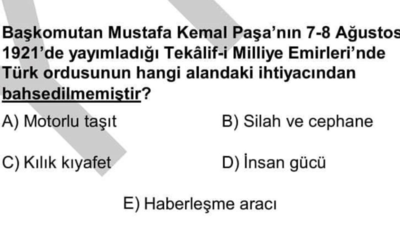 Öncelikle hatalı soru: "Başkomutan Mustafa Kemal Paşa'nın 7-8 Ağustos 1921'de yayımladığı Tekâlif-i Milliye Emirleri'nde Türk ordusunun hangi alandaki ihtiyacından bahsedilmemiştir?"
