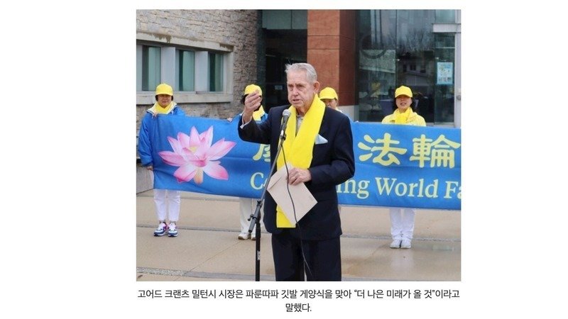 천국악단의 연주와 함께 밀턴 시청 앞에는 ‘파룬따파의 날’ 깃발이 서서히 오르기 시작했고 캐나다 국기와 온타리오주 깃발이 나란히 게양됐다.