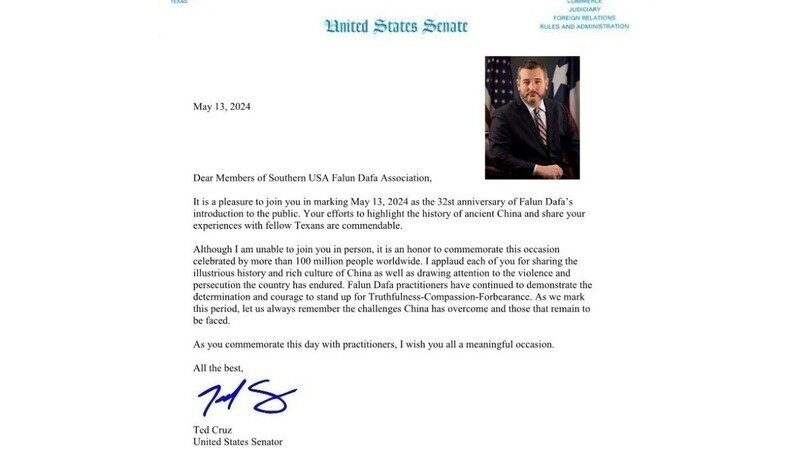 [명혜망]2024년 5월 13일은 파룬따파(法輪大法, 파룬궁)가 세계에 전해진 지 32주년이자 제25회 세계 파룬따파의 날이다. 텍사스주 출신의 테드 크루즈(Ted Cruz)와 존 코닌(John Cornyn) 연방 상원의원은 각각 남부 텍사스 파룬따파학회에 축하 서한을 보내 이 특별한 날을 축하했다. 크루즈 상원의원은 파룬따파 수련자들이 줄곧 진선인(真·善·忍)을 견지하는 결심과 용기를 보여주었다고 높이 평가했다.